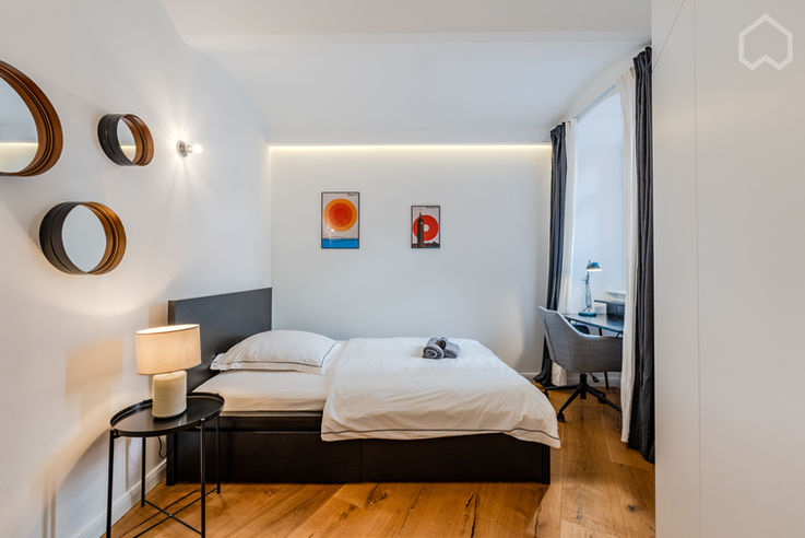 Our flat share apartments come in different shapes and sizes designed to meet all your needs in your new home. You can choose between a 2 or 3 bedroom apartment located on different floors in our state of the art conversion of a historical landmark. All our apartments offer a fully equipped open plan kitchen with a large communal space to lounge and relax after a busy day in the heart of Berlin. Your private bedroom comes with a super comfy queen size bed, ample closet and storage space, an office corner with a desk and stylish accessories. Bed linen and towels are provided.